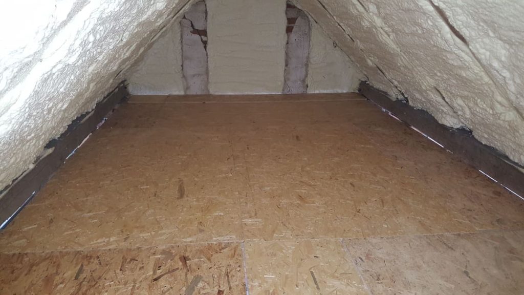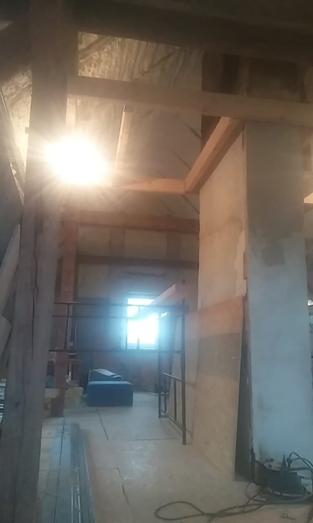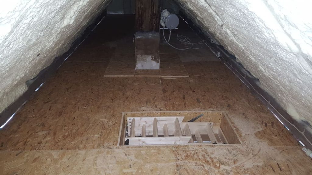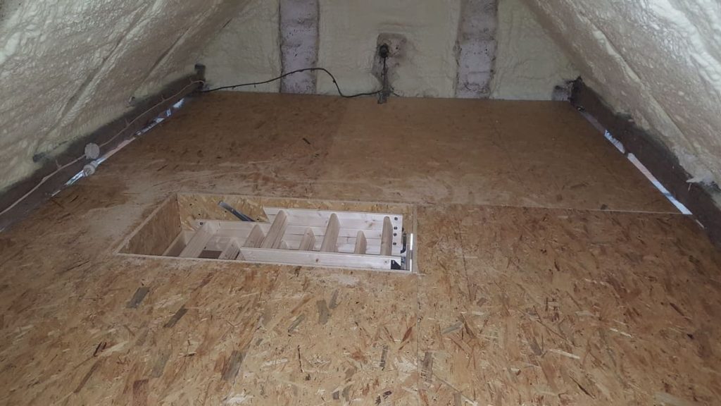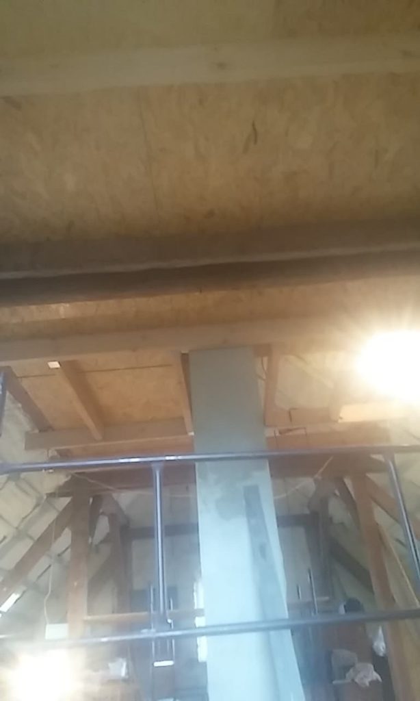 Sposób na dodatkowe pomieszczenie w domu? Wystarczy dobrze zagospodarować poddasze. Wykonaliśmy strop drewniany, stanowiący jednocześnie konstrukcję dla sufitu w pomieszczeniach poniżej, pokryty z góry płytą OSB. Wstawione zostały również schody strychowe